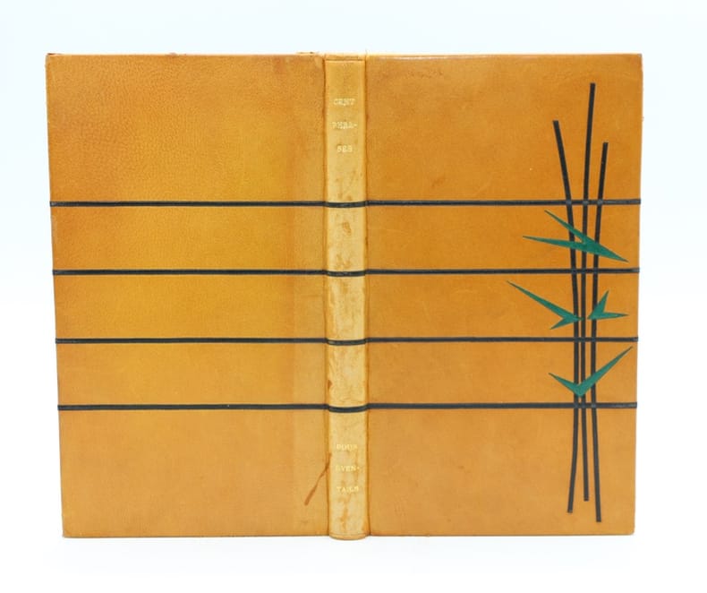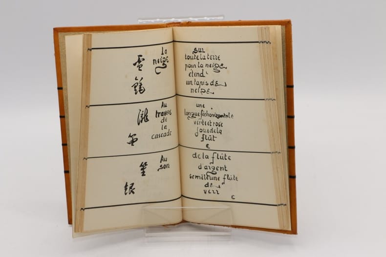 Paris, Gallimard, NRF, 1942. In-8 étroit, reliure décorative pleine-basane fauve (sign. Cladt), dos lisse, titre doré, décor de mosaïque noir et vert sur les plats, couvertures et dos conservés, non paginé, ex-dono ms sur la p. de garde. Recueil de cent soixante-douze haïkus composés par l'auteur entre juin 1926 et janvier 1927 lorsqu'il était ambassadeur de France à Tokyo ; il est illustré de caractères japonais calligraphiés par Ikuma Arishima.