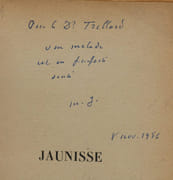 Edition originale, un des exemplaires du Service de Presse, enrichi d'un envoi autographe signé [M. J.] et daté de l'auteur. Petite déchir. et tache pâle sur la couv. sup., papier bruni, ex. correct cependant. - Frais de port : -France 4,95 € -U.E. 9 € -Monde (z B : 15 €) (z C : 25 €)