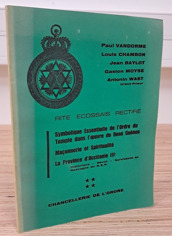 Paris, Dervy-Livres, 1979. In-8 br., 328 pp., figures en noir dans le texte, planches en couleur présentant les emblèmes des 33 degrés du rite écossais. Table des noms, bibliogr. Edition originale.