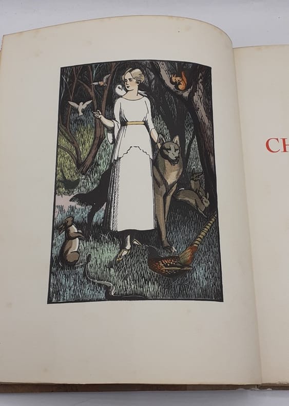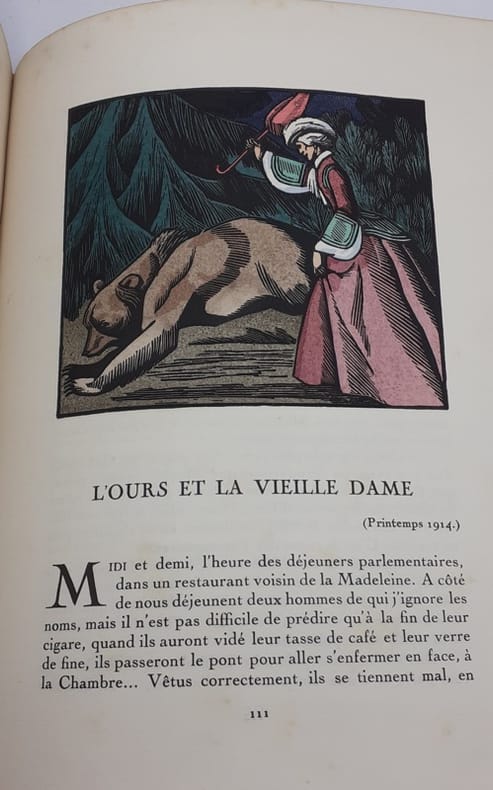 Paris, Ed. du capitole, 1926. In-4, rel. de l'ép. demi-papier parcheminé, plats et gardes de papier marbré, filet doré en encadrement sur le dos, pièce de titre vieux rose, titre doré, couv. cons. ; 142 pp., illustré par l'artiste d'un frontispice et de 33 en-têtes gravés sur bois en coul., rehaussés à l'aquarelle. Première édition illustrée, tirage à 765 exemplaires numérotés. Celui-ci un des 710 sur papier vélin de rives.